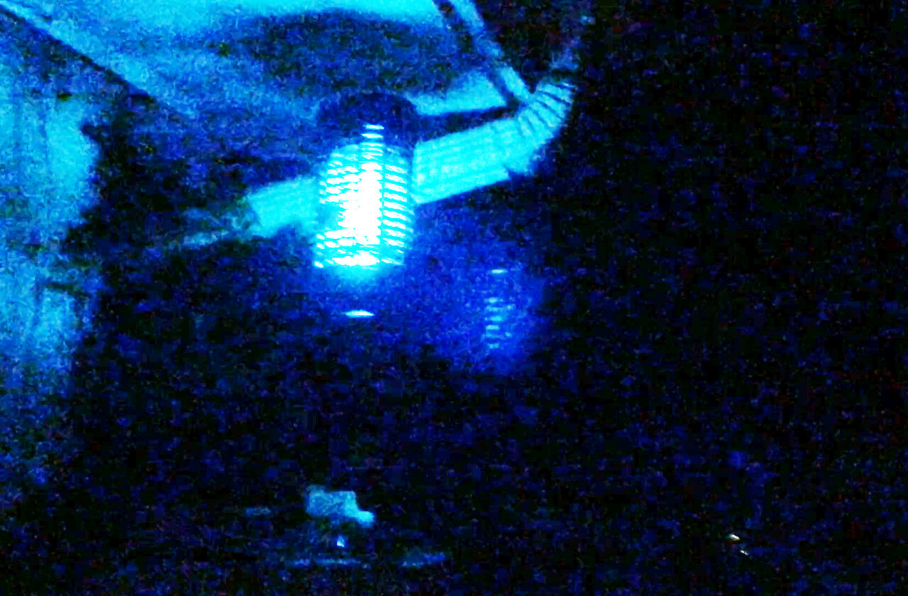 In this image, there is a paranormal hiding in the bug zapper. the weird reflection of the bug zapper is to the lower right of the bug zapper. The reflection is of the BACK side of the bug zapper, and not the front, which is what we would expect to see.